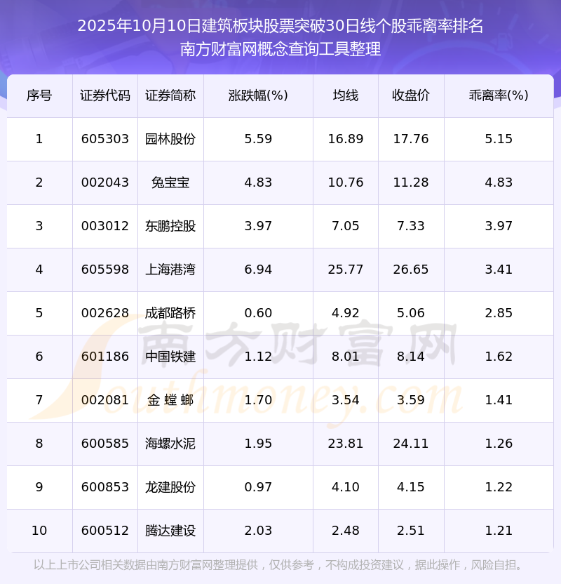 2025年10月10日建筑板塊股票突破30日線個股乖離率排名