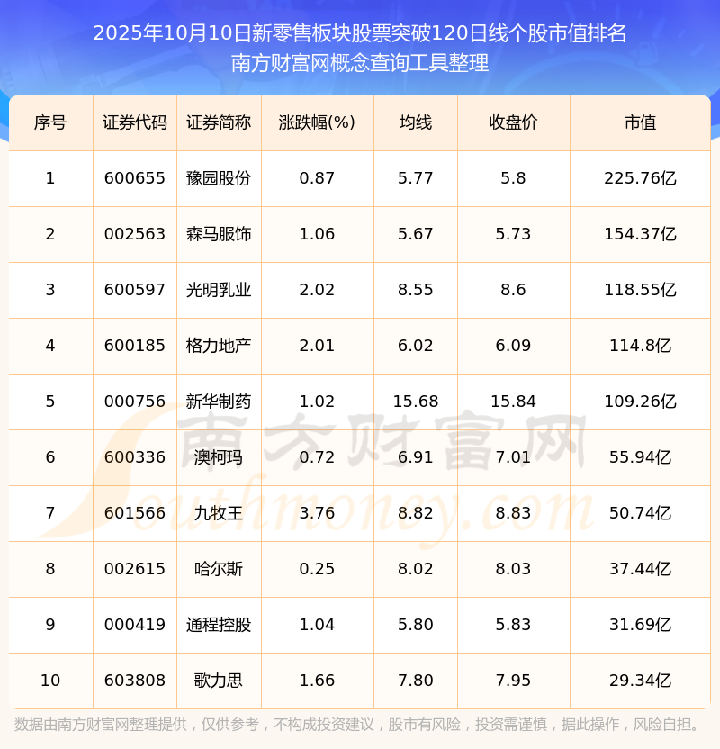 2025年10月10日新零售板塊股票突破120日線個股市值排名
