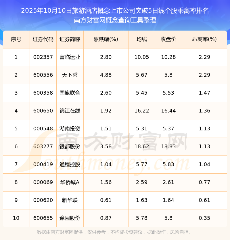 2025年10月10日旅游酒店概念上市公司突破5日線個股乖離率排名
