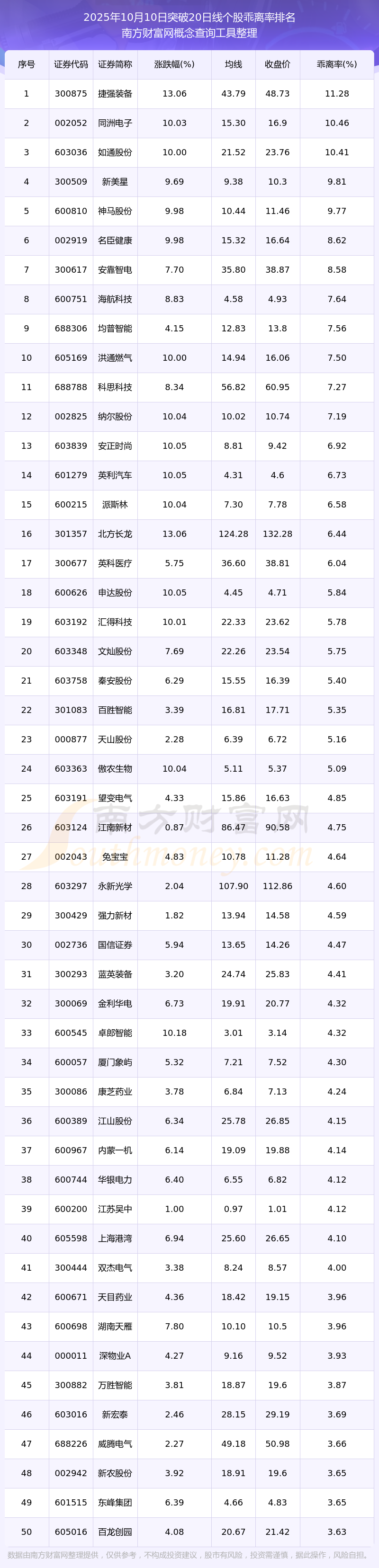 2025年10月10日突破20日線個股乖離率排名
