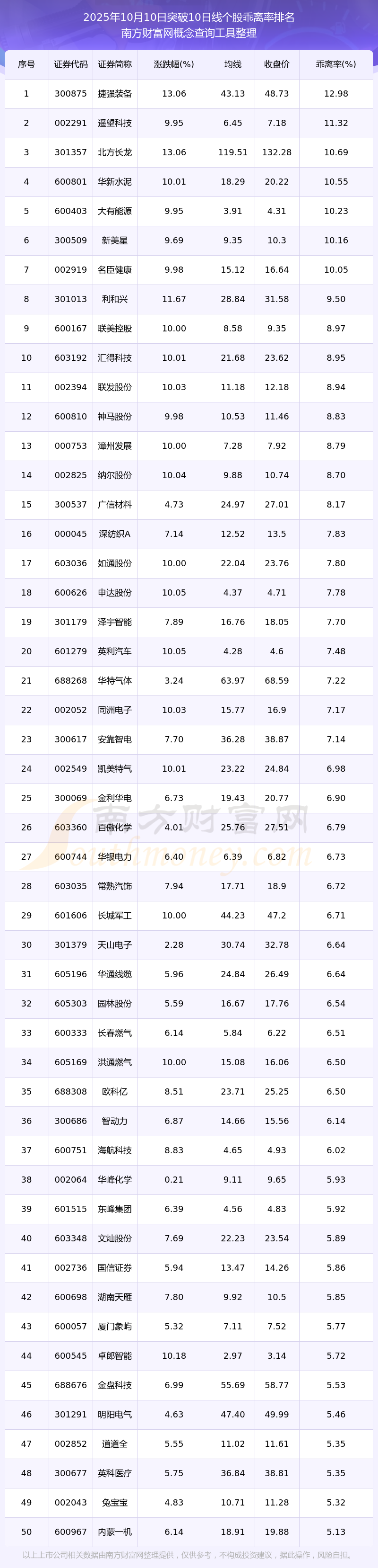 2025年10月10日突破10日線個(gè)股乖離率排名
