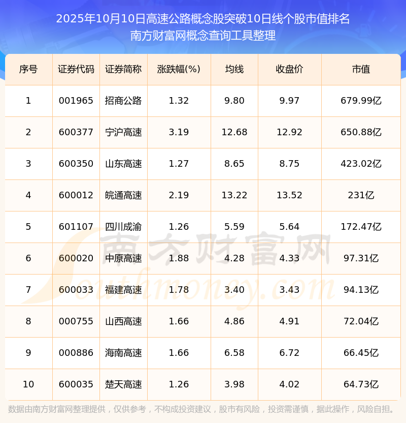 2025年10月10日高速公路概念股突破10日線個股市值排名