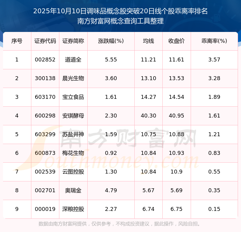 2025年10月10日調(diào)味品概念股突破20日線個(gè)股乖離率排名