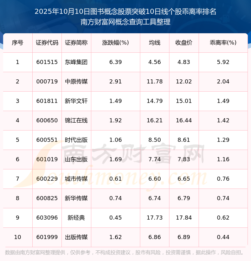 2025年10月10日圖書概念股票突破10日線個(gè)股乖離率排名