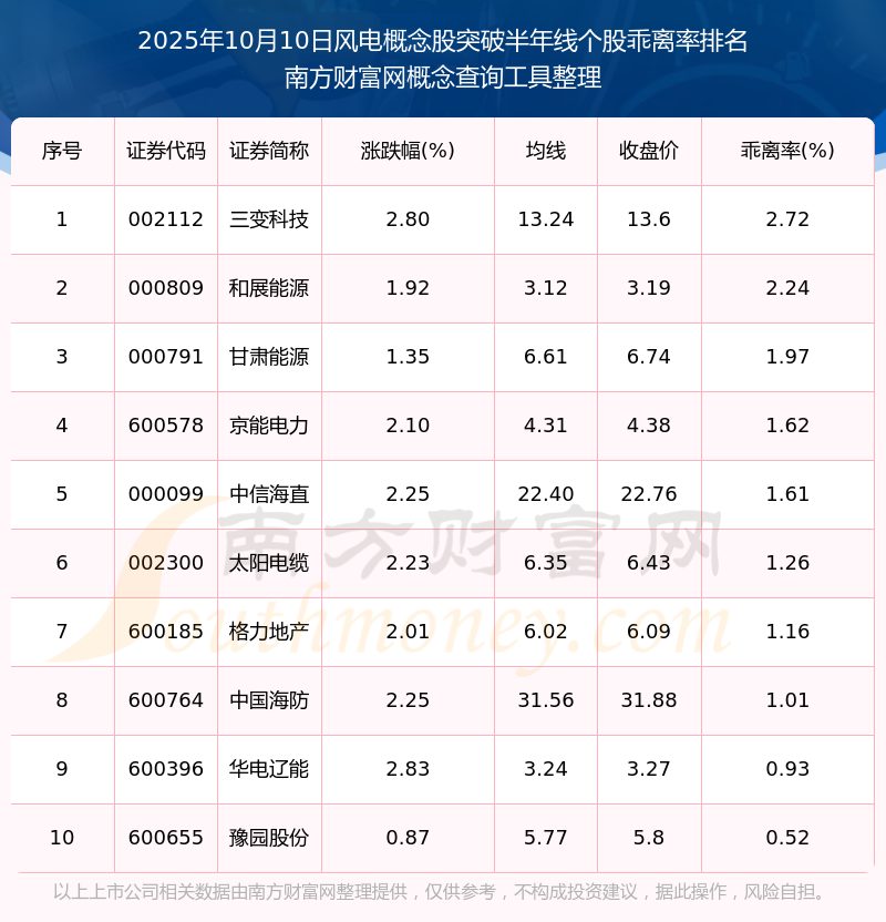 2025年10月10日風(fēng)電概念股突破半年線個股乖離率排名