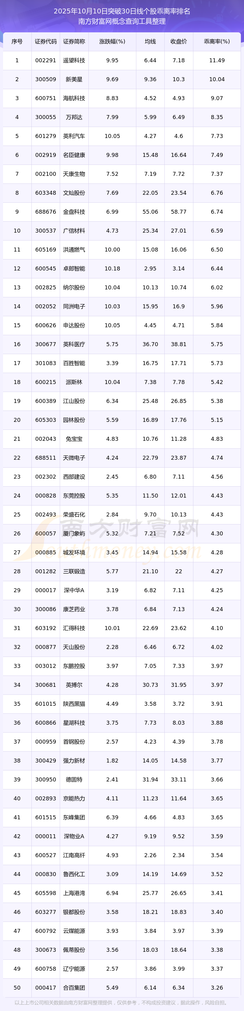 2025年10月10日突破30日線個(gè)股乖離率排名