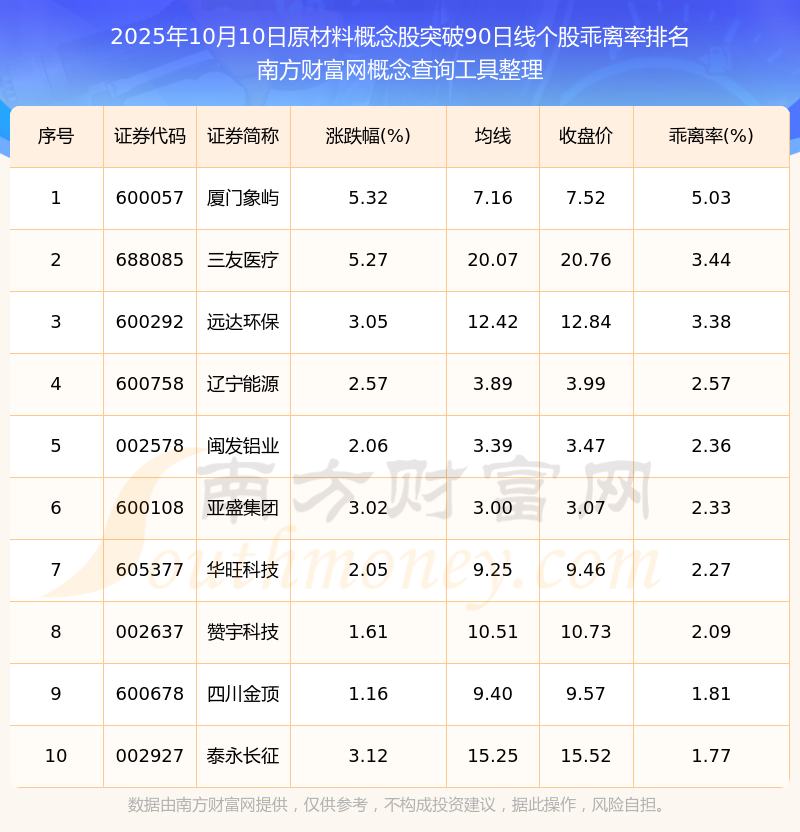 2025年10月10日原材料概念股突破90日線個(gè)股乖離率排名
