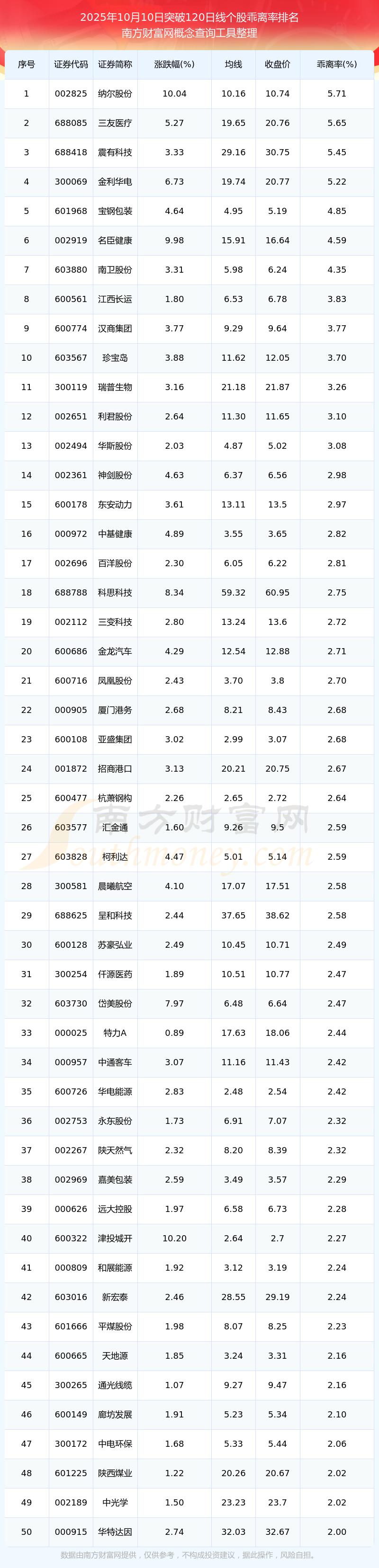 2025年10月10日突破120日線個股乖離率排名