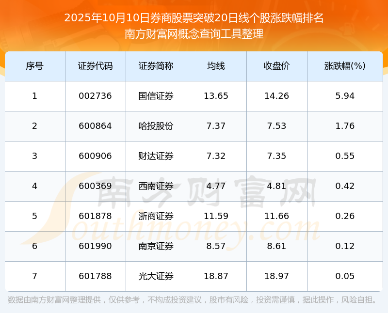 2025年10月10日券商股票突破20日線個股漲跌幅排名