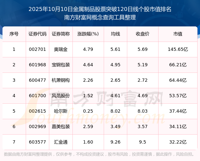 2025年10月10日金屬制品股票突破120日線個(gè)股市值排名