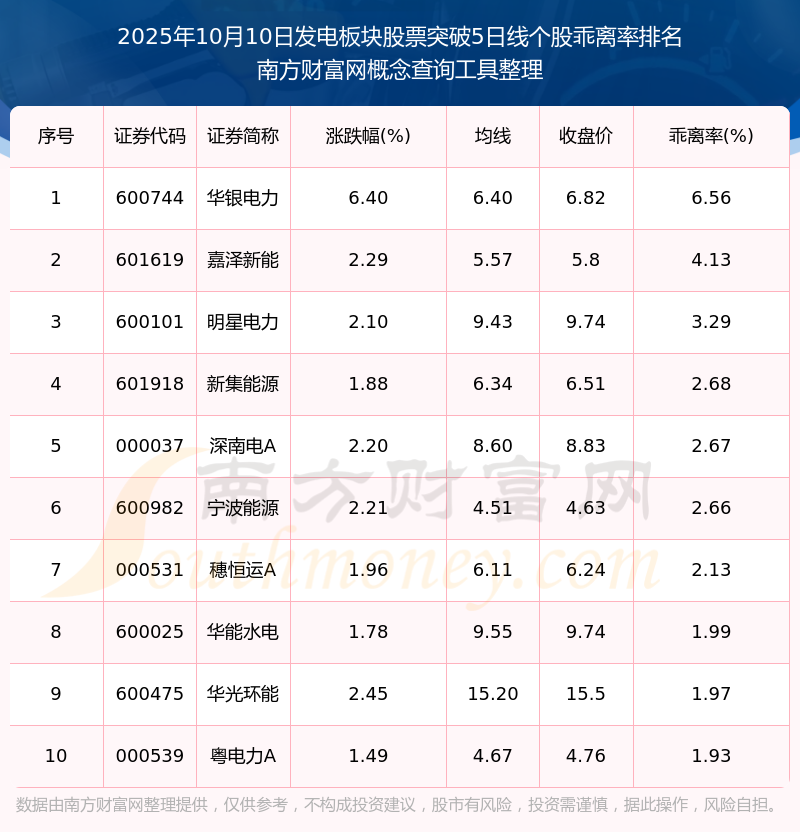2025年10月10日發(fā)電板塊股票突破5日線個(gè)股乖離率排名