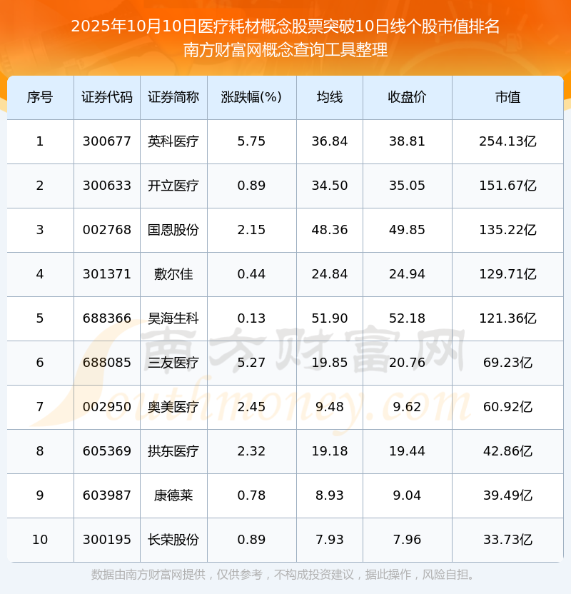2025年10月10日醫(yī)療耗材概念股票突破10日線個股市值排名