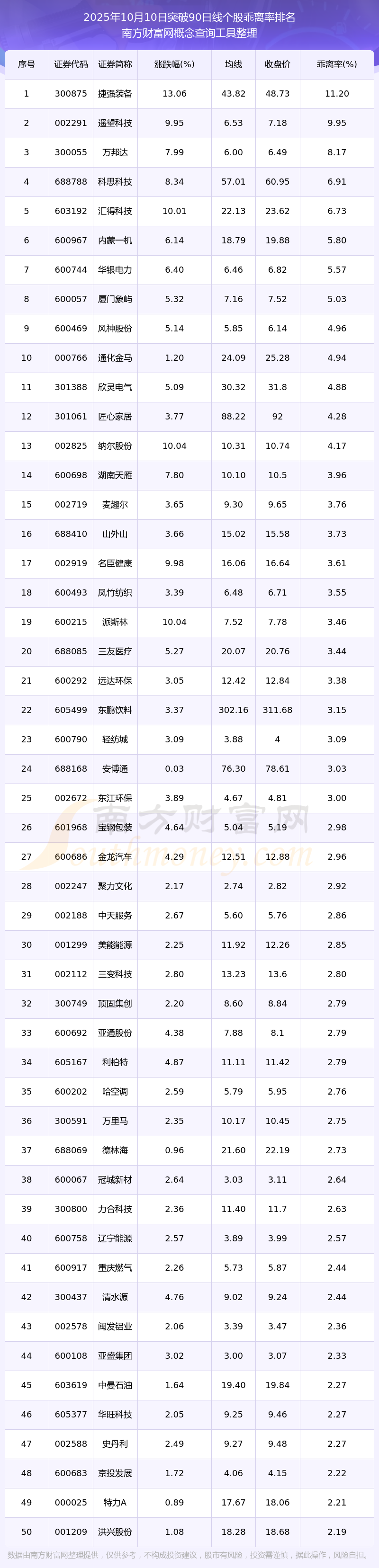 根據(jù)南方財富網(wǎng)概念查詢工具數(shù)據(jù)統(tǒng)計,截止2025年10月10日收盤,共有260只個股收盤價向上突破了90日線,其中乖離率較大的個股有捷強(qiáng)裝備、遙望科技、萬邦達(dá)、科思科技、匯得科技等,乖離率分別為11.20%、9.95%、8.17%、6.91%、6.73%。