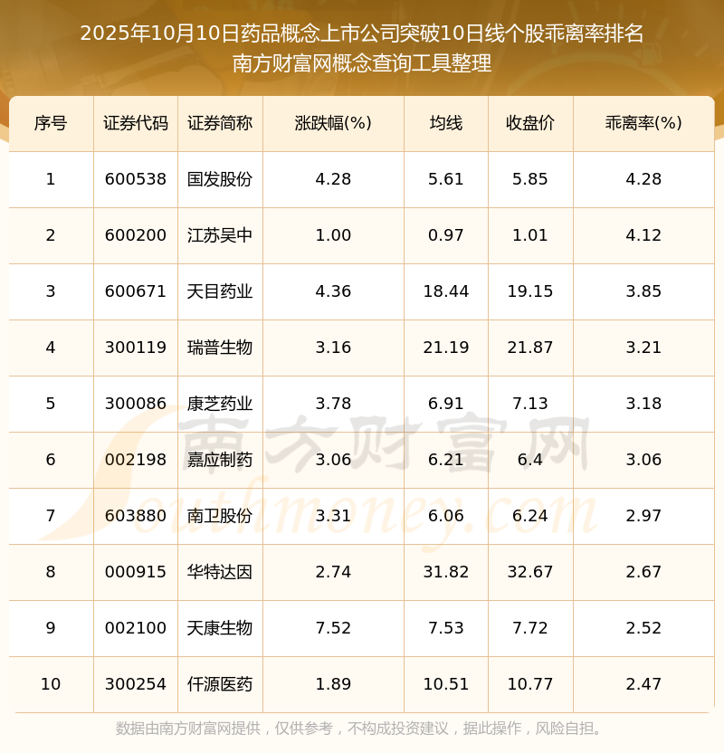 根據(jù)南方財富網(wǎng)概念查詢工具數(shù)據(jù)統(tǒng)計,截止2025年10月10日收盤,藥品概念上市公司共有83只個股收盤價向上突破了10日線。其中乖離率較大的個股有國發(fā)股份、江蘇吳中、天目藥業(yè)等,乖離率分別為4.28%、4.12%、3.85%。