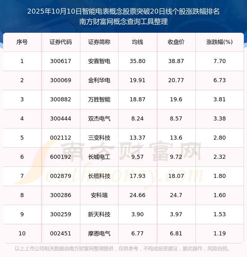 2025年10月10日智能電表概念股票突破20日線個(gè)股漲跌幅排名