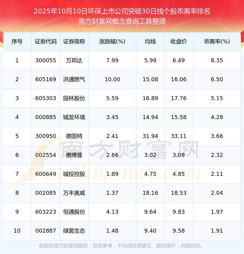 2025年10月10日環(huán)保上市公司突破30日線個股乖離率排名