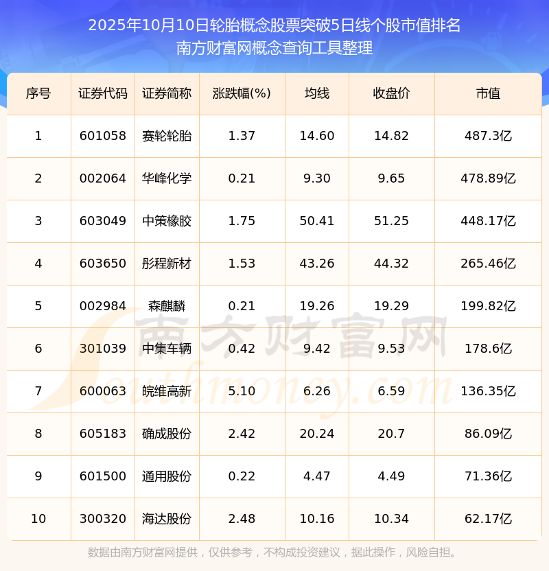 2025年10月10日輪胎概念股票突破5日線個股市值排名