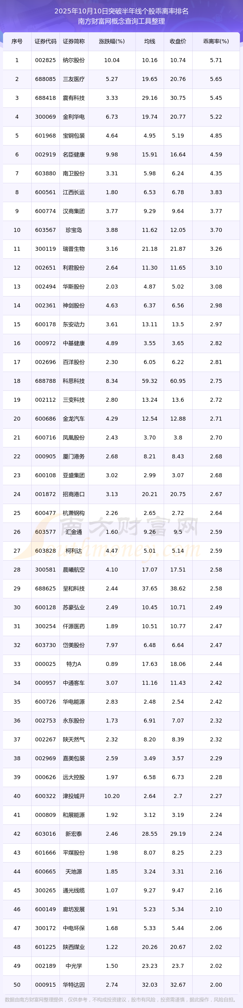 2025年10月10日突破120日線個(gè)股乖離率排名