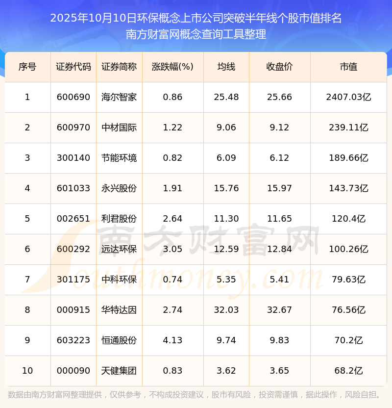 2025年10月10日環(huán)保概念上市公司突破半年線個(gè)股市值排名