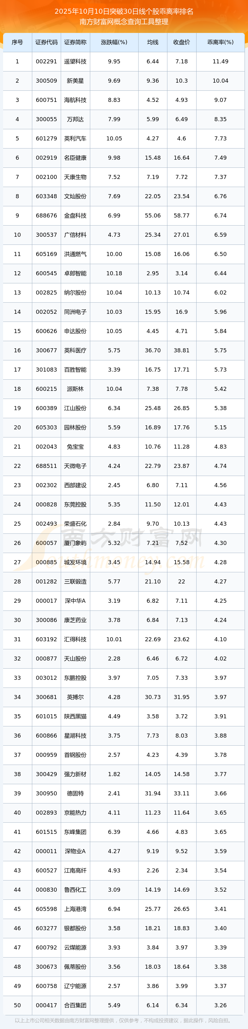 2025年10月10日突破30日線個(gè)股乖離率排名