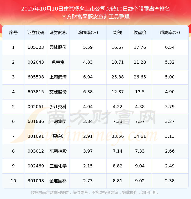 2025年10月10日建筑概念上市公司突破10日線個股乖離率排名