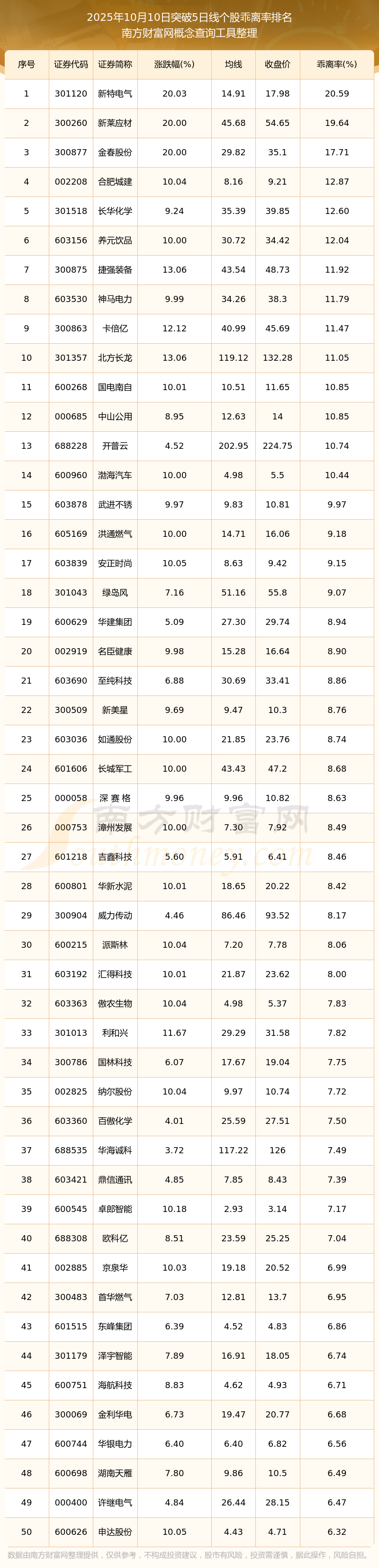 根據(jù)南方財富網(wǎng)概念查詢工具數(shù)據(jù)統(tǒng)計,截止2025年10月10日收盤,共有1450只個股收盤價向上突破了5日線,其中乖離率較大的個股有新特電氣、新萊應(yīng)材、金春股份、合肥城建、長華化學(xué)等,乖離率分別為20.59%、19.64%、17.71%、12.87%、12.60%。