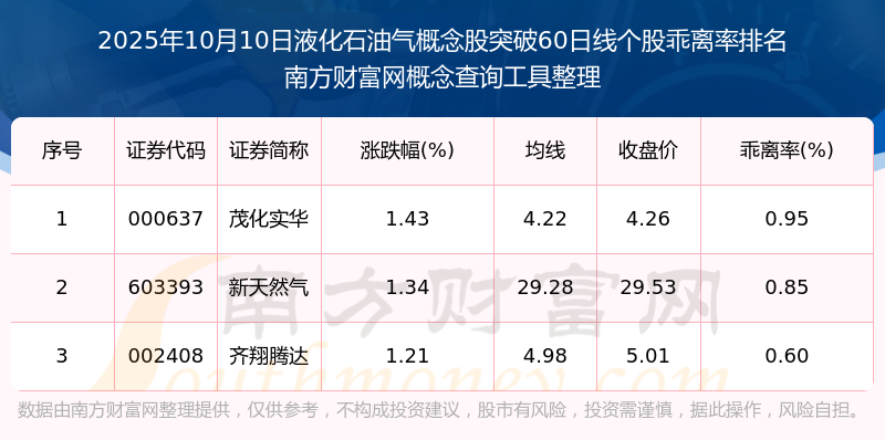 2025年10月10日液化石油氣概念股突破60日線(xiàn)個(gè)股乖離率排名