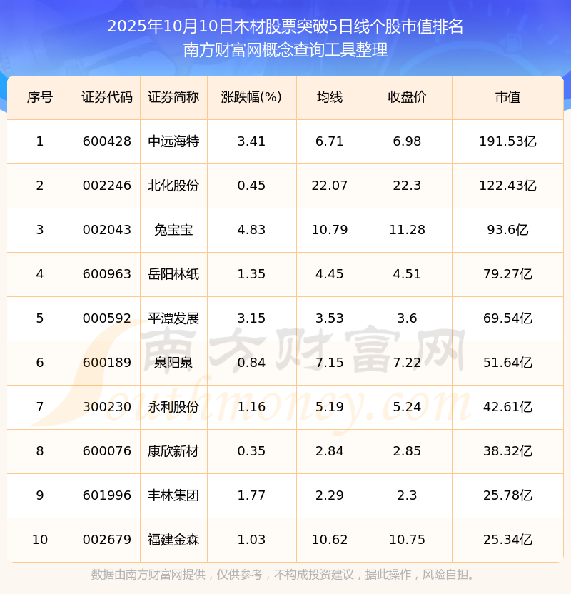 2025年10月10日木材股票突破5日線個股市值排名