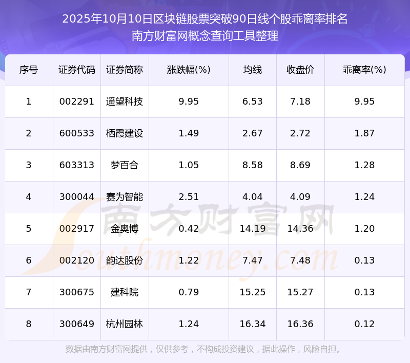 2025年10月10日區(qū)塊鏈股票突破90日線個(gè)股乖離率排名