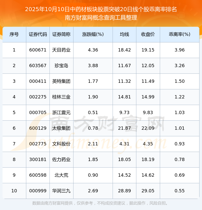 2025年10月10日中藥材板塊股票突破20日線個股乖離率排名