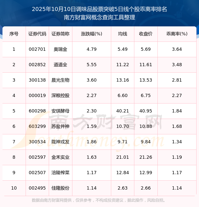 2025年10月10日調(diào)味品股票突破5日線個(gè)股乖離率排名