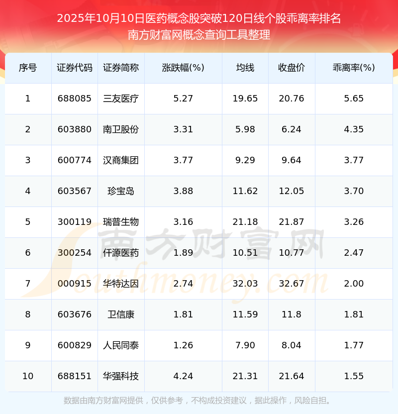 2025年10月10日醫(yī)藥概念股突破120日線個股乖離率排名