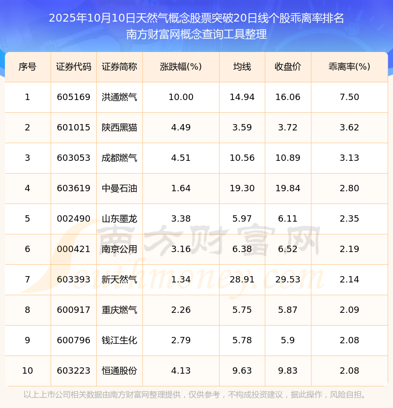 2025年10月10日天然氣概念股票突破20日線個股乖離率排名