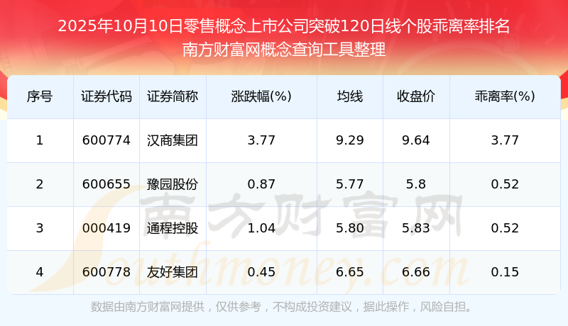 2025年10月10日零售概念上市公司突破120日線(xiàn)個(gè)股乖離率排名