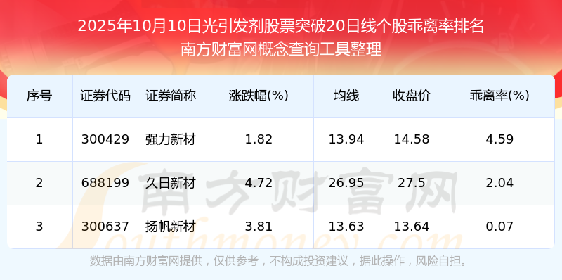 2025年10月10日光引發(fā)劑股票突破20日線個(gè)股乖離率排名