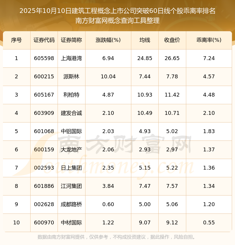2025年10月10日建筑工程概念上市公司突破60日線個股乖離率排名