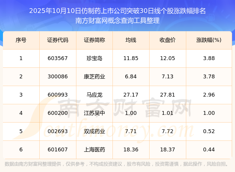 根據(jù)南方財富網(wǎng)概念查詢工具數(shù)據(jù)統(tǒng)計,截止2025年10月10日收盤,仿制藥上市公司共有6只個股收盤價向上突破了30日線。其中漲幅較大的個股有珍寶島、康芝藥業(yè)、馬應(yīng)龍等,漲幅分別為3.88%、3.78%、2.96%。