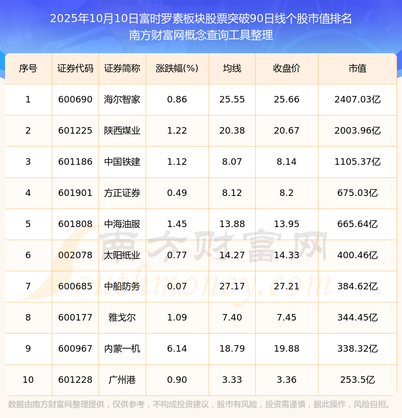 根據(jù)南方財富網(wǎng)概念查詢工具數(shù)據(jù)統(tǒng)計,截止2025年10月10日收盤,富時羅素板塊股票共有44只個股收盤價向上突破了90日線。其中市值較大的個股有海爾智家、陜西煤業(yè)、中國鐵建等,市值分別為2407.03億、2003.96億、1105.37億。
