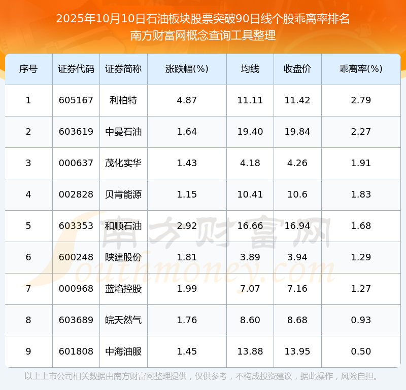 2025年10月10日石油板塊股票突破90日線個(gè)股乖離率排名