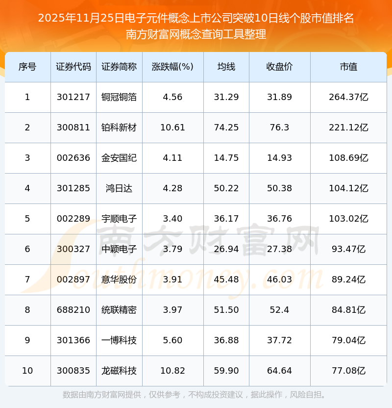 2025年11月25日電子元件概念上市公司突破10日線個(gè)股市值排名