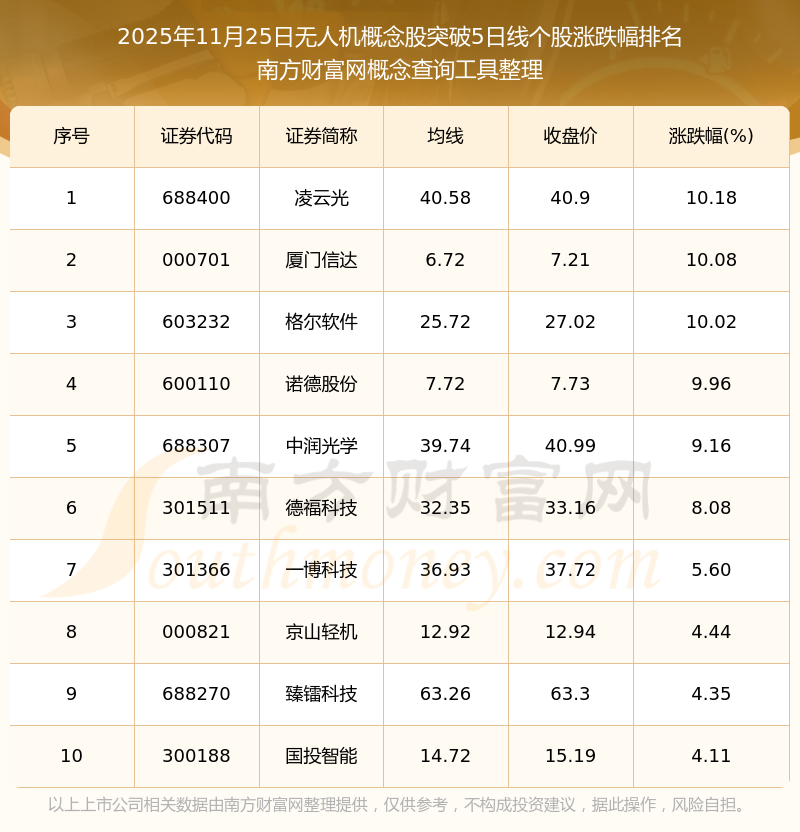 2025年11月25日無人機(jī)概念股突破5日線個(gè)股漲跌幅排名