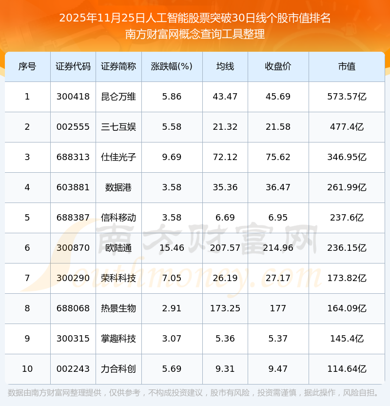 2025年11月25日人工智能股票突破30日線個(gè)股市值排名