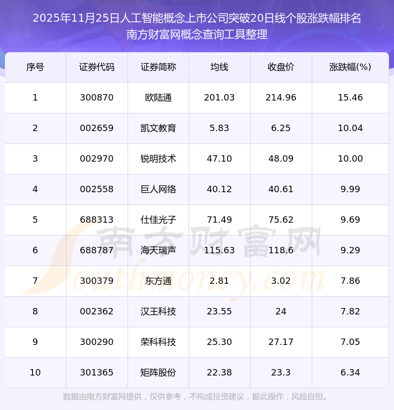 根據(jù)南方財(cái)富網(wǎng)概念查詢工具數(shù)據(jù)統(tǒng)計(jì),截止2025年11月25日收盤,人工智能概念上市公司共有31只個(gè)股收盤價(jià)向上突破了20日線。其中漲幅較大的個(gè)股有歐陸通、凱文教育、銳明技術(shù)等,漲幅分別為15.46%、10.04%、10.00%。