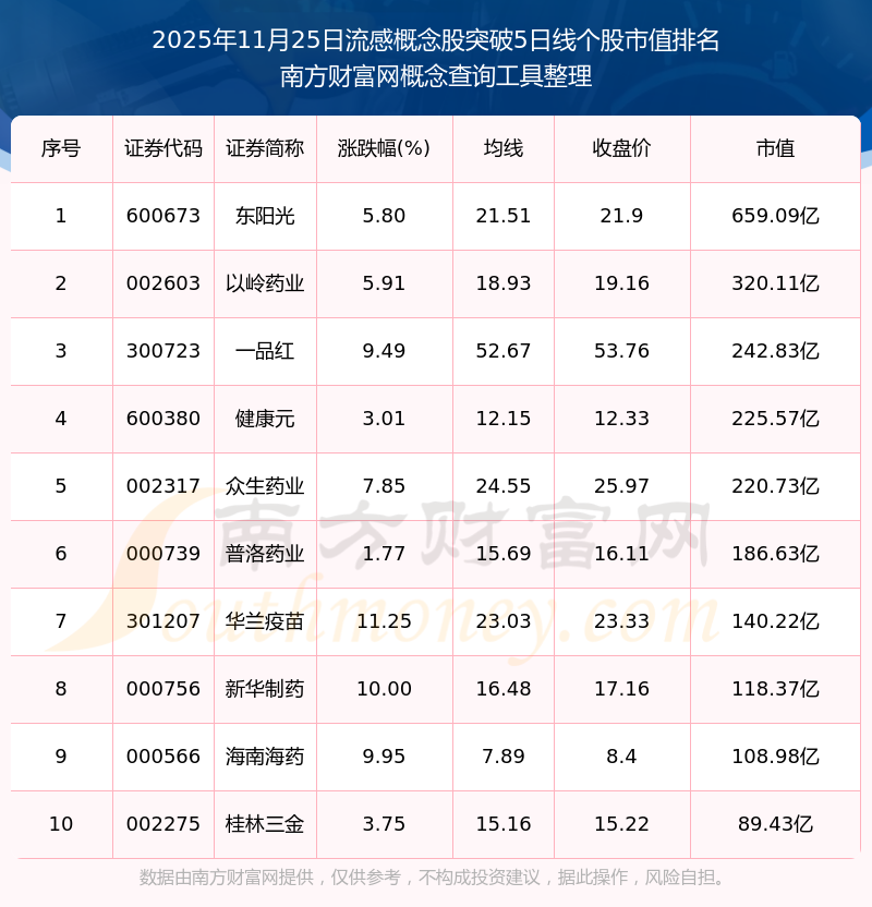 根據(jù)南方財富網(wǎng)概念查詢工具數(shù)據(jù)統(tǒng)計,截止2025年11月25日收盤,流感概念股共有19只個股收盤價向上突破了5日線。其中市值較大的個股有東陽光、以嶺藥業(yè)、一品紅等,市值分別為659.09億、320.11億、242.83億。