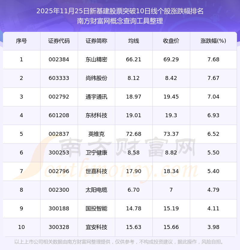 根據南方財富網概念查詢工具數據統(tǒng)計,截止2025年11月25日收盤,新基建股票共有13只個股收盤價向上突破了10日線。其中漲幅較大的個股有東山精密、尚緯股份、通宇通訊等,漲幅分別為7.68%、7.67%、7.04%。