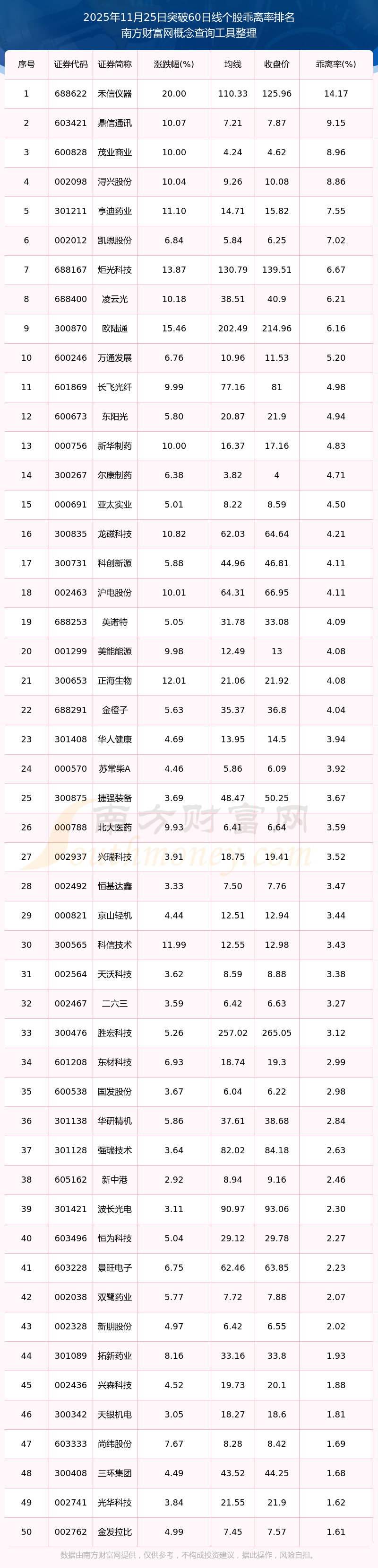 根據(jù)南方財(cái)富網(wǎng)概念查詢工具數(shù)據(jù)統(tǒng)計(jì),截止2025年11月25日收盤,共有92只個股收盤價向上突破了60日線,其中乖離率較大的個股有禾信儀器、鼎信通訊、茂業(yè)商業(yè)、潯興股份、亨迪藥業(yè)等,乖離率分別為14.17%、9.15%、8.96%、8.86%、7.55%。