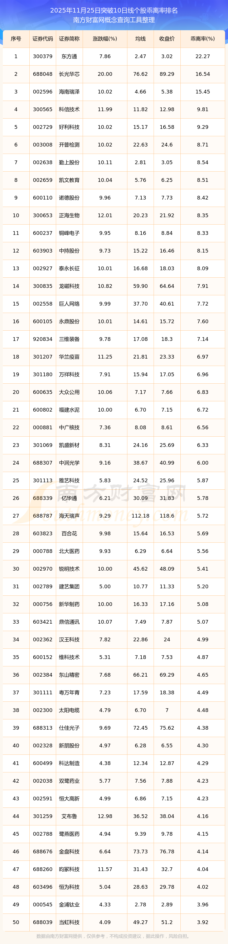 2025年11月25日突破10日線個(gè)股乖離率排名