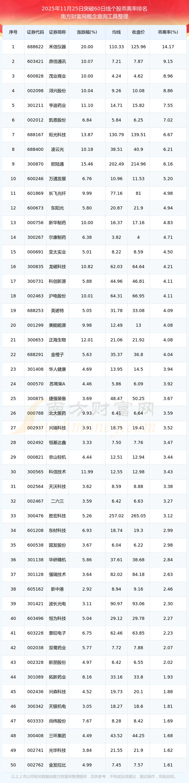 根據(jù)南方財富網(wǎng)概念查詢工具數(shù)據(jù)統(tǒng)計,截止2025年11月25日收盤,共有92只個股收盤價向上突破了60日線,其中乖離率較大的個股有禾信儀器、鼎信通訊、茂業(yè)商業(yè)、潯興股份、亨迪藥業(yè)等,乖離率分別為14.17%、9.15%、8.96%、8.86%、7.55%。