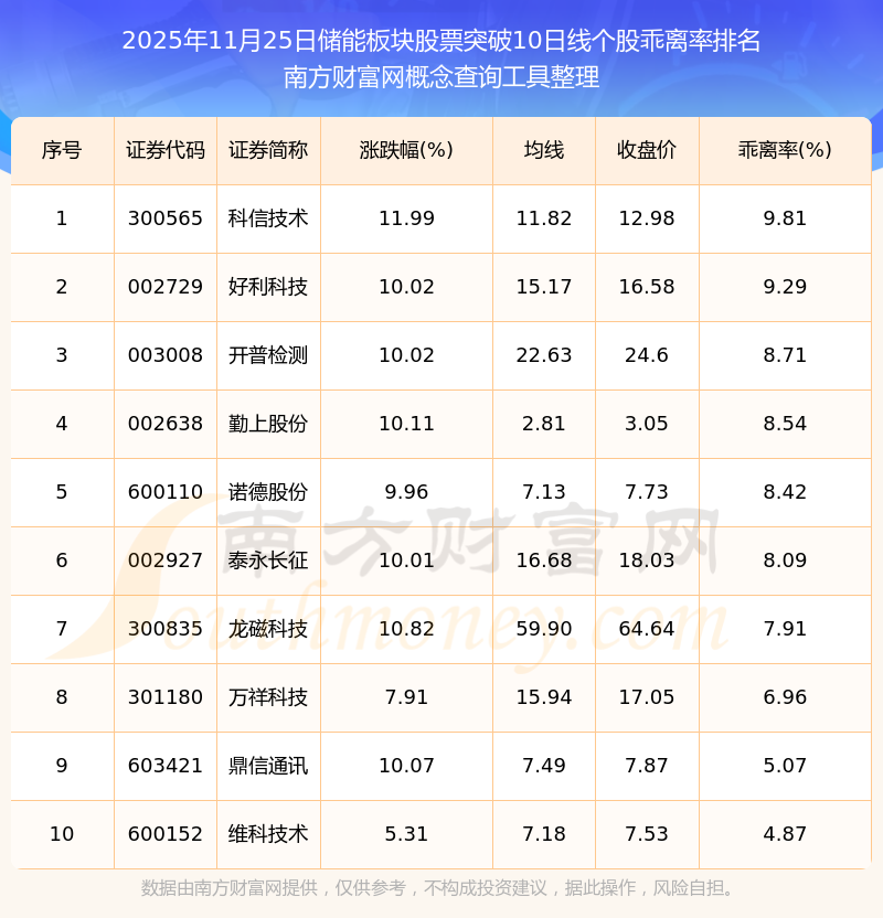 根據(jù)南方財富網(wǎng)概念查詢工具數(shù)據(jù)統(tǒng)計,截止2025年11月25日收盤,儲能板塊股票共有32只個股收盤價向上突破了10日線。其中乖離率較大的個股有科信技術、好利科技、開普檢測等,乖離率分別為9.81%、9.29%、8.71%。