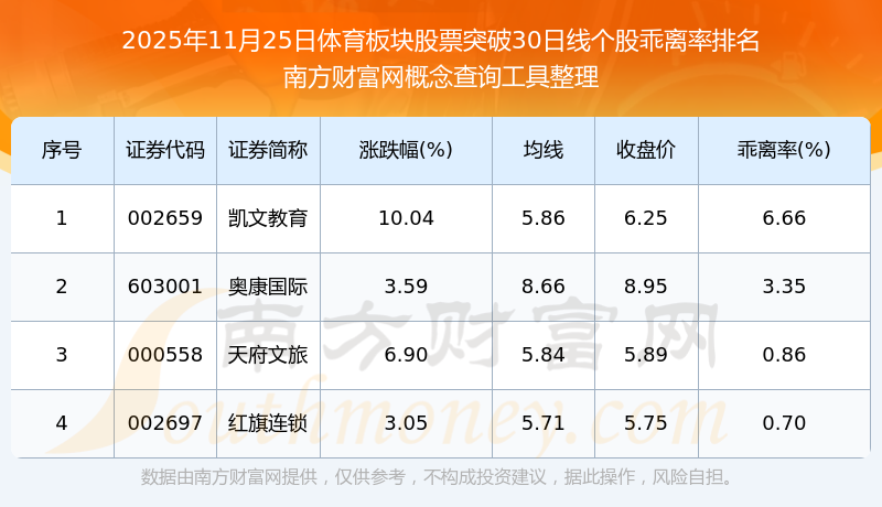 2025年11月25日體育板塊股票突破30日線個股乖離率排名